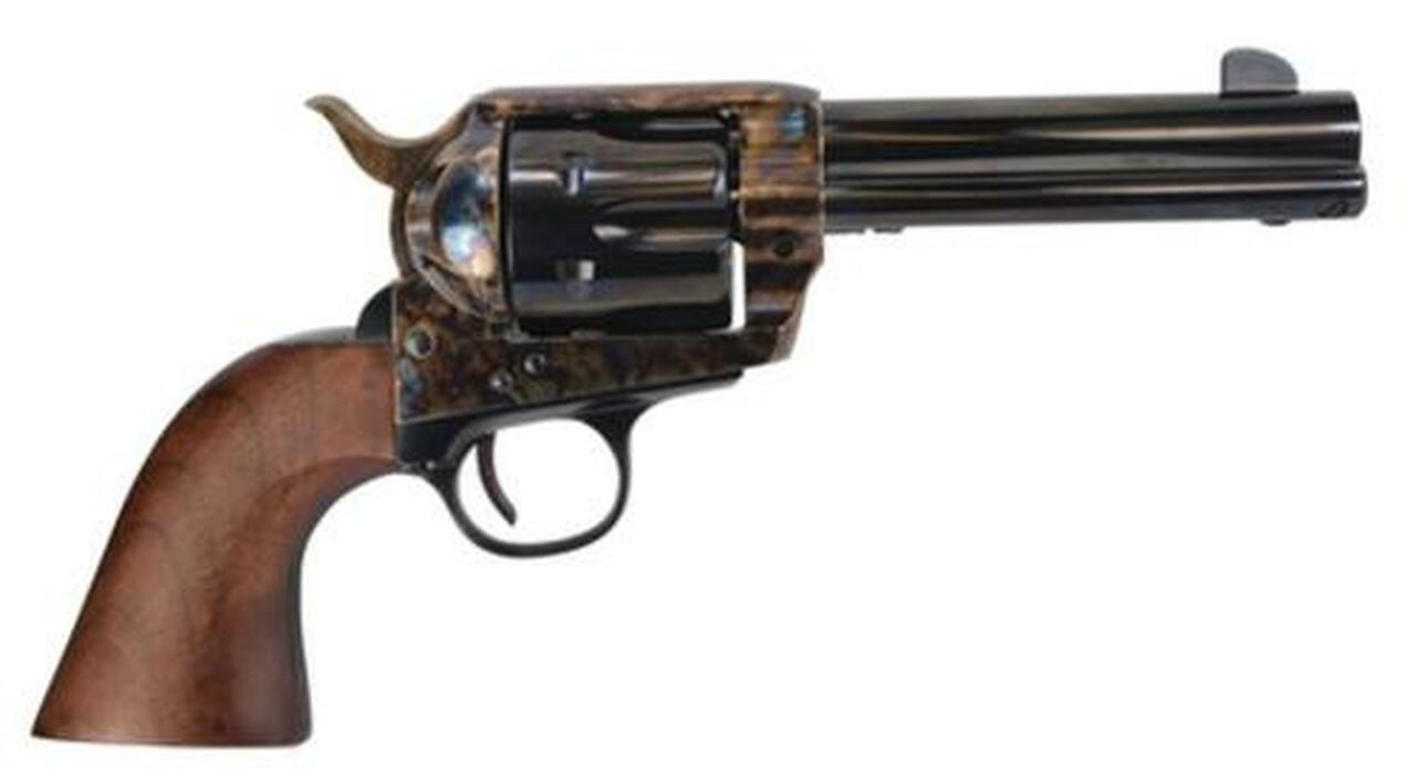 High polish all steel gun with factory tuned action.Type : RevolverAction : SingleCaliber : 357/38 SpecialBarrel Length : 4.75″Grips : WalnutFrame Description : Color Case Hardened Pre-War