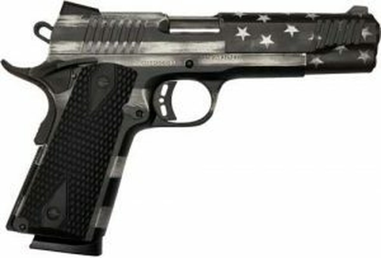Citadel 1911-A1 features a Series 70 firing system, forged steel frame and slide with an extended slide stop, skeletonized hammer and trigger. It utilizes lowered and flared ejection port, beveled magazine well, and an extended ambidextrous thumb and beavertail grip safety. The full size model has a 5″ barrel with a full size guide rod and comes with two 8-round magazines. This 9mm model has a gray-scale American Flag cerakote metal finish with black G10 grips.Barrel Length 5″