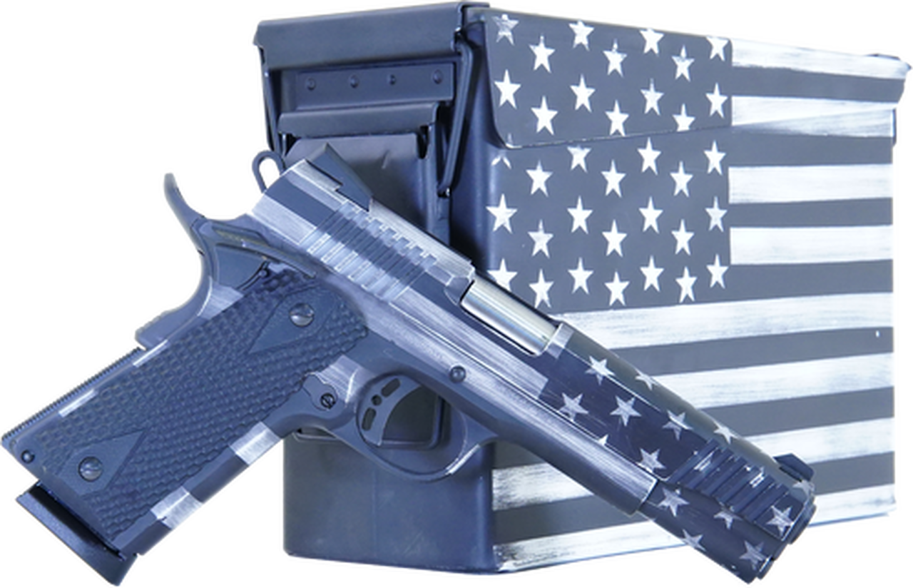 Citadel 1911-A1 features a Series 70 firing system, forged steel frame and slide with an extended slide stop, skeletonized hammer and trigger. It utilizes lowered and flared ejection port, beveled magazine well, and an extended ambidextrous thumb and beavertail grip safety. The full size model has a 5″ barrel with a full size guide rod and comes with two 8-round magazines. This 45ACP model has a gray-scale American Flag cerakote metal finish with black G10 grips. It also includes an ammo can.Category : PistolsType : PistolAction : SingleCaliber : 45 ACPBarrel Length : 5″Capacity : 8+1Safety : Ambidextrous Thumb/BeavertailGrips : Black G10Sight Configuration : 3-DotWeight : 36.8 ozFrame Finish : American Flag Battleworn Gray Cerakote