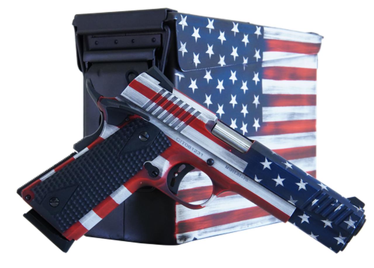 Citadel 1911-A1 features a Series 70 firing system, forged steel frame and slide with an extended slide stop, skeletonized hammer and trigger. It utilizes lowered and flared ejection port, beveled magazine well, and an extended ambidextrous thumb and beavertail grip safety. The full size model has a 5″ barrel with a full size guide rod and comes with two 8-round magazines. This 45ACP model has a red/white/blue American Flag cerakote metal finish with black G10 grips. It also includes an ammo can.Category : PistolsType : PistolAction : SingleCaliber : 45 ACPBarrel Length : 5″Capacity : 8+1Safety : Ambidextrous Thumb/BeavertailGrips : Black G10Sight Configuration : 3-DotWeight : 36.8 ozFrame Finish : American Flag Cerakote