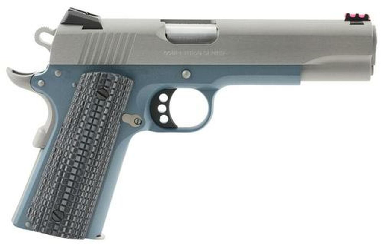 Colt’s 1911 Competition pistol features custom G10 blue grips with a scallop texture and the Colt logo, dual recoil spring system, a National Match barrel. It has Novak sights for precision shooting; a fiber optic front with adjustable rear sight. It comes with two magazines and spare sight fibers.