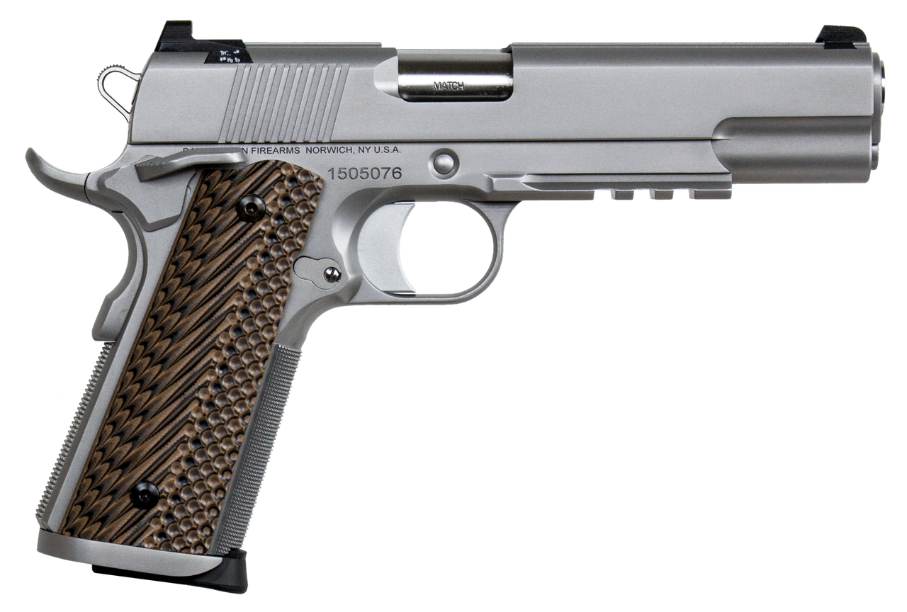 Another pistol getting a facelift for 2020, the Specialist features a new style light rail frame (as seen on the Kodiak) as well as forward cocking serrations and Dan Wesson inset slide serrations that reduce glare between the sights. The stainless steel slide has a 1913-style rail integrated into it for installation of lights and lasers, while the undercut trigger guard and 25 LPI frontstrap checkering help plant the pistol. Controls are prominent, with an ambidextrous thumb safety, extended magazine release and a magwell to facilitate quick reloads. Finished off with a set of G-10 grips that guide the hand up and into the extended beavertail, the Specialist is topped with a set of tritium sights front and rear, the back sight configured in a stacked dot style.Action : SAOCaliber : 9mm LugerBarrel Length : 5″Capacity : 10+1Safety : Ambidextrous ManualGrips : Black/Brown G10Sight Configuration : Fixed Tritium NightFrame Finish : Stainless Steel