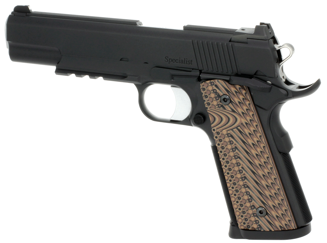 Dan Wesson uses the best components and finishes the industry has to offer creating the best possible 1911.The 1911 Specialist is ideal for law enforcement and home defense. The forged stainless steel slide features a Clark-style serrated rib while the frame sports an integral 1913 Picatinny, 25 LPI front strap checkering, undercut trigger guard and recessed slide stop. It is also equipped with an ambidextrous thumb safety, extended magazine release, detachable two-piece magwell and G10 VZ Operator II grips.Action : SAOCaliber : 45 ACPBarrel Length : 4.25″Capacity : 8+1Safety : Ambidextrous Manual/GripGrips : Black/Brown G10Sight Configuration : Fixed NightFrame Finish : Black