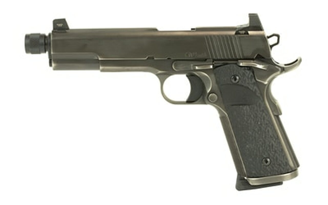 This 45 ACP model has a suppressor-ready, 5.75″ threaded barrel and 8-round capacity.Category : PistolsType : PistolAction : SingleCaliber : 45 Automatic Colt Pistol (ACP)Barrel Length : 5.75″Capacity : 8+1Safety : ManualGrips : Black G10Sight Configuration : NightWeight : 42.3 ozFrame Finish : Distressed