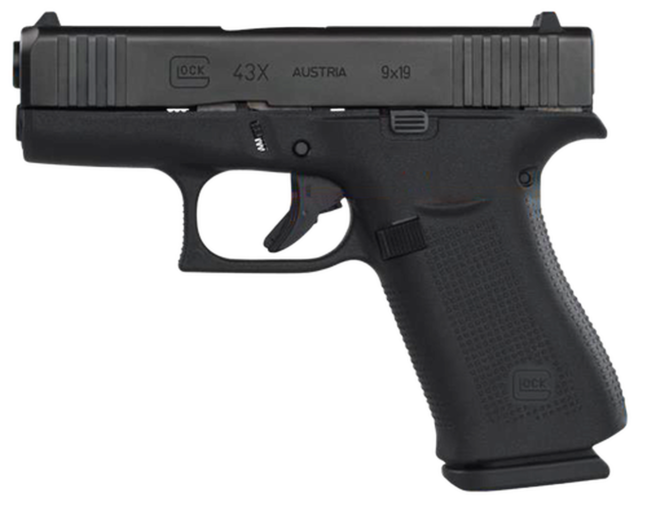 Designed for comfort, The G43X combines a compact-size grip length, a built-in beaver tail and a subcompact-slim slide for a comfortably balanced, versatile grip thats ideal for a variety of users. The frame incorporates elements of the Gen5 and Slimline series such the short trigger distance, a frame with a built-in beavertail, a reversible magazine catch and the incredibly accurate, match-grade GLOCK Marksman Barrel (GMB) and precision-milled front serrations.Action : DAOCaliber : 9mm LugerBarrel Length : 3.41″Capacity : 10+1Grips : Black PolymerSight Configuration : AmeriGlo Fiber OpticWeight : 16.4 ozFrame Finish : Black