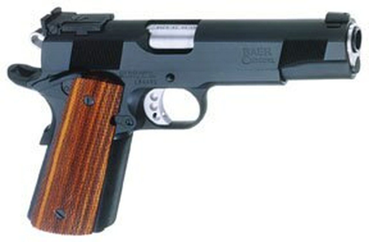Baer NM steel frame, NM slide and NM barrel with stainless bushing • Slide fitted to frame • Double serrated slide • Low mount LCB adjustable sight with hidden rear leaf • Baer dovetail front sight • Lowered and flared ejection port • Tuned and polished extractor • Baer extended ejector • Baer checkered slide stop• Baer speed trigger with crisp 4 lb pull • Baer deluxe Commander hammer and sear • Baer beavertail grip safety with pad • Flat serrated mainspring housing • Beveled mag well • Polished feed ramp and throated barrel • Baer extended ambi safety • High checkered front strap @ 30 lpi • Pistol tuned for total reliability • Baer Premium Checkered grips • Blued finish • (2) 8-round premium magazines