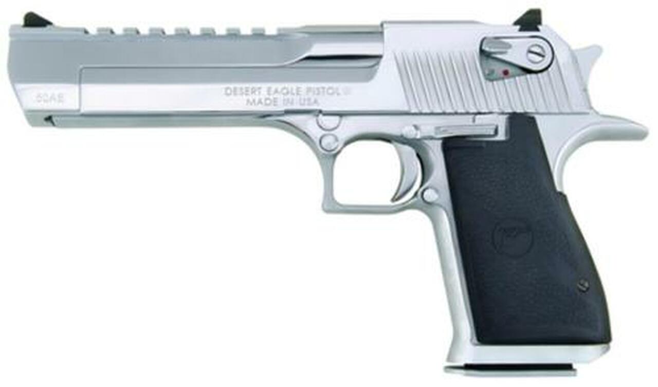 Magnum Research Desert Eagle Pistol MRDE50PC, 50 AE, 6″, Polished Chrome Finish, 7 RdSpecifications:Caliber: .50 A.E.Action: Gas Operated Single ActionCapacity: 7 RoundsSafety: AmbidextrousFinish: Polished ChromeFrame: Steel/AlloyBarrel Length: 6″; rifling: 1 turn in 19″Sights: Drift Adjustable Rear, Ramp Style FrontGrips: Anatomically formed plasticOverall Length: 10.6″Overall Width: 1.25″Overall Height: 6.25″Weight: 72.4 oz.