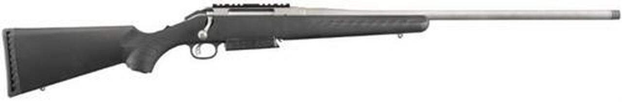 Ruger’s American Rifle has a trigger that offers a crisp release with a pull weight that is user adjustable between three and five pounds, allowing shooters to make that perfect shot. It features an ergonomic, lightweight nylon synthetic stock designed for quick, easy handling blends a classic look with modern forend contouring and grip serrations.The patent-pending Power Bedding integral bedding block system positively locates the receiver and free-floats the barrel for outstanding accuracy. This rifle offers a visible, accessible and easy-to-actuate tang safety that provides instant security, and a single-column detachable box magazine. Included is a magazine, sling swivel studs and factory-installed one-piece aluminum scope rail.Category : Rifles CenterfireAction : BoltCaliber : 300 Winchester MagnumBarrel Length : 24″Capacity : 3+1Safety : TangOAL : 44.5″Weight : 7.5 lbsStock Description : Synthetic BlackMetal Finish : Stainless Steel