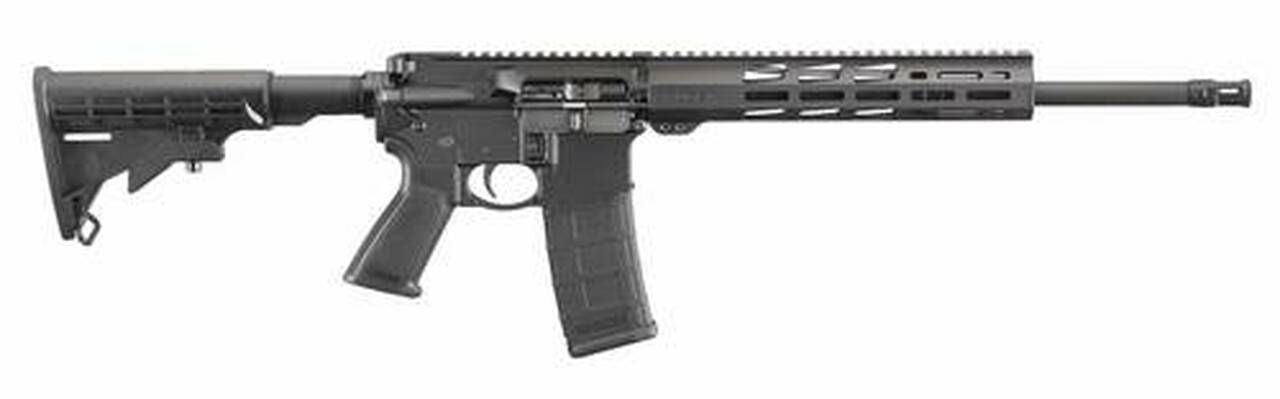 This Ruger AR-556 semi-automatic rifle is made from forged aerospace-grade 7075-T6 aluminum. The hard coat anodized, flattop upper receiver includes a forward assist, dust cover and brass deflector, while the Magpul M-Lok handguards are made from heat-resistant glass-filled nylon. It also has a bolt machined from 9310 alloy steel, single-stage trigger, chrome-plated bolt carrier with a matte black oxide finish on the exterior. The AR-556 also utilizes a heavy contour, cold hammer-forged barrel and ergonomic pistol grip.Category : Rifles Centerfire TacticalAction : Semi-AutomaticCaliber : 223 Remington/5.56 NATOBarrel Length : 16.1″Capacity : 30+1Trigger : Single-StageOAL : 32.25″-35.5″Weight : 6.7 lbsStock Description : 6-Position BlackMetal Finish : Black Hardcoat Anodized