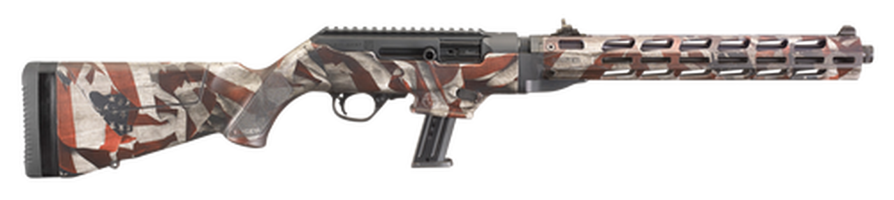 The Ruger PC Carbine features American Flag Camo with an integrated Picatinny-style rail and in Type III hard-coat anodized for maximum durability. Features a threaded barrel with included thread protector that allows for use of standard muzzle accessories; interchangeable magazine wells for use of common Ruger and Glock magazines. Ships with SR-Series pistol magazine well installed and an additional magazine well accepting Glock magazines is included; accurate sighting system with adjustable ghost ring rear aperture sight and non-glare, protected blade front sight; Soft rubber buttpad with spacers allows the rifle to be properly sized for different shooters or varying levels of outerwear or defensive gear; durable glass-filled nylon synthetic buttstock features a proprietary texture for enhanced control and an integral sling mount for rapid sling attachment; light, crisp trigger pull with minimal overtravel and positive reset utilizing proven 10/22 trigger components and the heavy contour barrel provides consistent accuracy, while barrel fluting sheds unnecessary weight and allows for quick handling. Includes one SR-Series pistol magazine, three 1/2″ spacers and hex wrenches for rear sight adjustment, buttpad spacer adjustment and charging handle removal.Action : Semi-AutomaticCaliber : 9mm LugerBarrel Length : 16.12″Capacity : 17+1OAL : 34.37″Weight : 7 lbsStock Description : FixedMetal Finish : American Flag Cerakote/Black Nitride