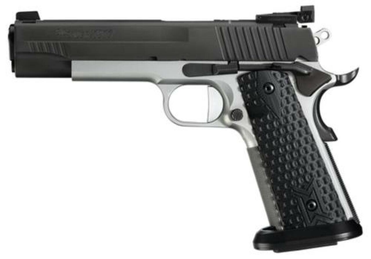 Single action only. Competition pistol designed by Champion Shooter, Max Michel Jr. Nitron-finished stainless slide features forward cocking serrations, on top of a natural stainless frame with 26LPI checkering on the front strap. Max’s “MM” logo is custom engraved on the slide and machined into the Hogue custom G-10 Chainlink grips, which offer a very aggressive, non-slip surface to the shooter. Sig lat trigger, external extractor and Dawson Ice Magwell, Koenig Speed Hammer, and EGW sear and firing pin. Wilson magazine. Fiber optic front sight and adjustable rear sights.Barrel Length : 5Capacity : 8Finish : Two-ToneItem Description : SIG 1911 MAX 45ACP 5 R2T G10 8Barrel Length Range : 5 to 5.9Made In The USA : Made In The USAHand Gun Web Model : Model 1911