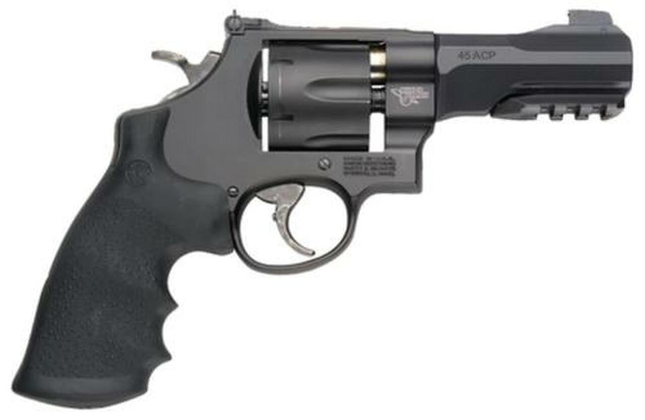 When serious collectors and demanding shooters want the very best handguns, they turn to Smith & Wesson’s Performance Center®. Known the world over for their unique design and uncompromising quality, Smith & Wesson’s master gunsmiths build each handgun from the ground up – combining old-world hand-craftsmanship with modern technology to create extremely accurate, high performance models designed for the most demanding shooters. Contact your Smith & Wesson dealer to discuss the availability of these superb, limited edition handguns.Category : RevolversType : RevolverAction : Single/DoubleCaliber : 45 Automatic Colt Pistol (ACP)Barrel Length : 4.0″Capacity : 6Hammer Style : SpurredGrips : Black SyntheticSights : Gold Bead Front, Adjustable RearWeight : 31 ozFrame Description : Black Scandium Alloy