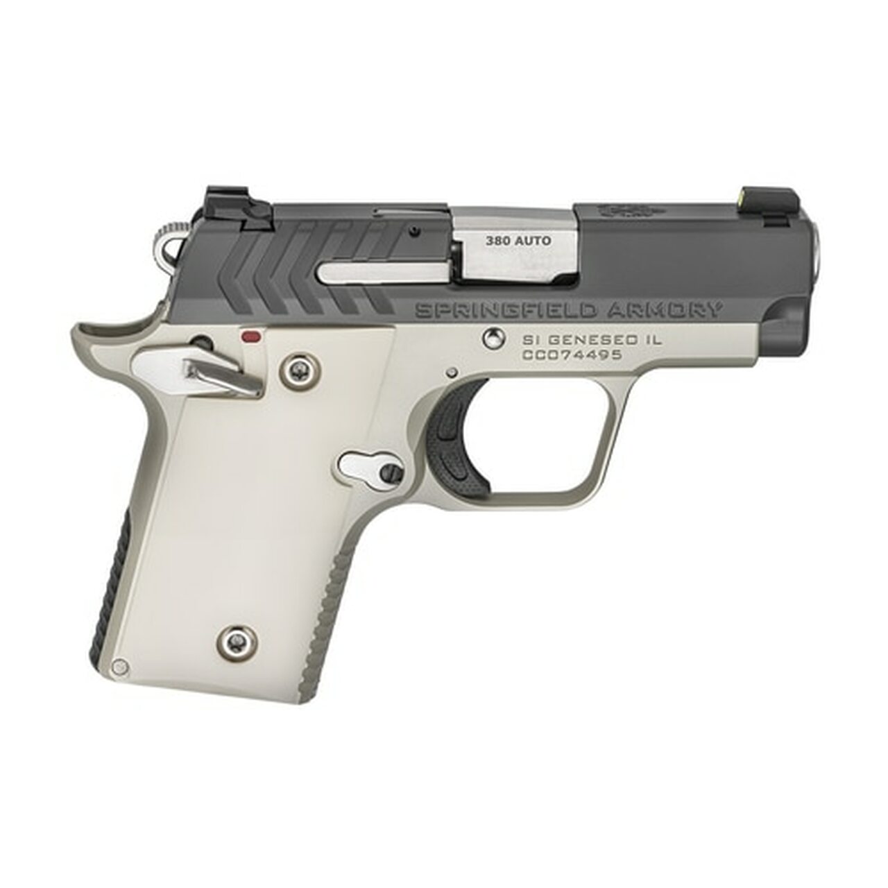Springfield, 911, 1911 Micro Compact, 380ACP, 2.7″ Barrel, Alloy Frame, Platinum Finish, Graphite Cerakote Slide, 2 Magazines, 1-6Rd & 1-7Rd, Engineered Ivory Grips, Tritium Night SightsManufacturer Part #: PG9109PG