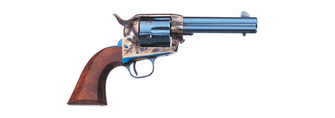 The single-action Army was most widely produced with a color case-hardened frame and blued barrel. Meanwhile, a nickel-plated version was issued to Indian scouts. And a bright charcoal blue finish was available from the factory. But with years of use, the old 6-guns took on a well-handled soft gray patina. All of these classic finishes are available in the 1873 Cattleman.Overall Length: 11″