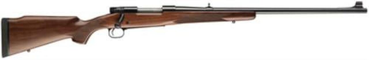 Satin finish Monte Carlo walnut stock with cut checkering. Alloy one-piece bottom metal adds rigidity for better accuracy. Polished metal surfaces. Forged steel receiver with integral recoil lug is bedded front and rear. Pre-’64 style controlled round feed with claw extractor. Three-position safety. Cold hammer-forged free floating barrel with blue finish. Recessed target crown. Folding adjustable rear sight with hooded brass bead front. M.O.A. trigger system with zero take-up, zero creep and zero overtravel. Blade-type ejector. Pachmayr Decelerator Recoil Pad. Assembled in Portugal.Caliber-Gauge : .338 WIN. MAG.